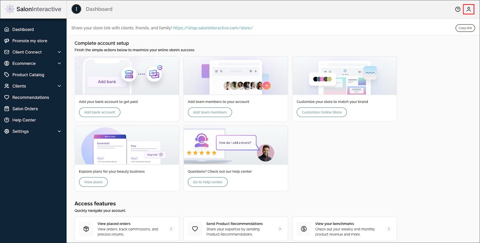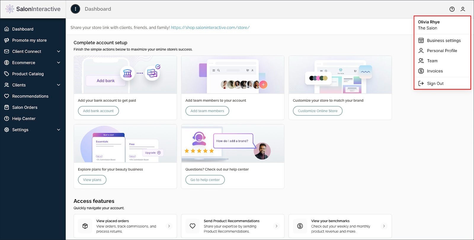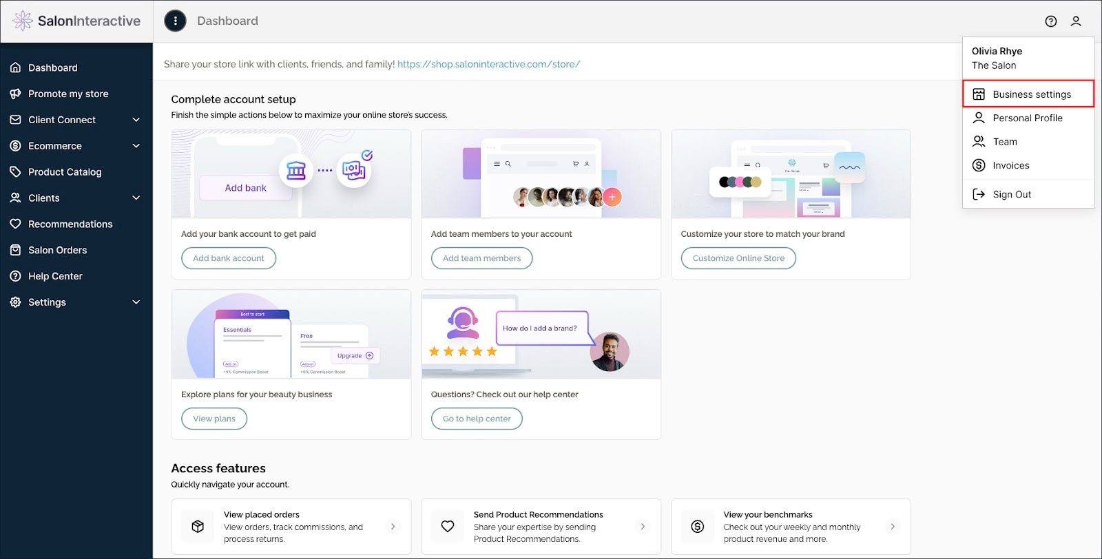 First, log into SalonInteractive. In the upper right side, click the profile icon and then Business settings.