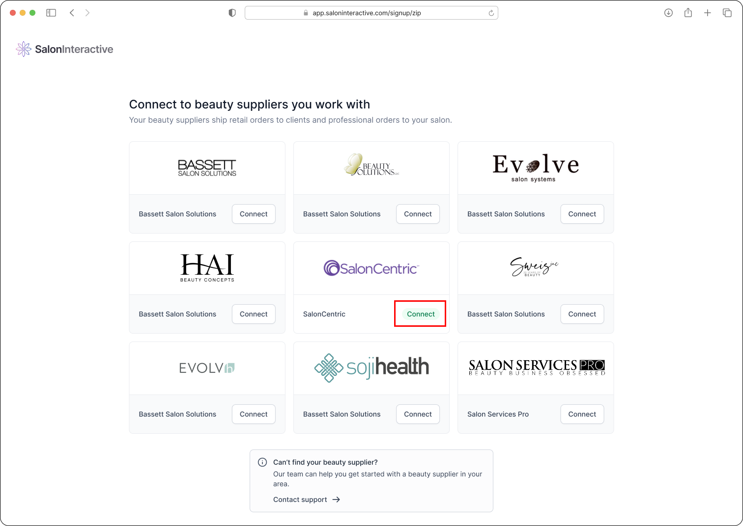 Based on your ZIP code, the beauty suppliers available in your area will be displayed on the next page. Find your beauty supplier and click Connect.