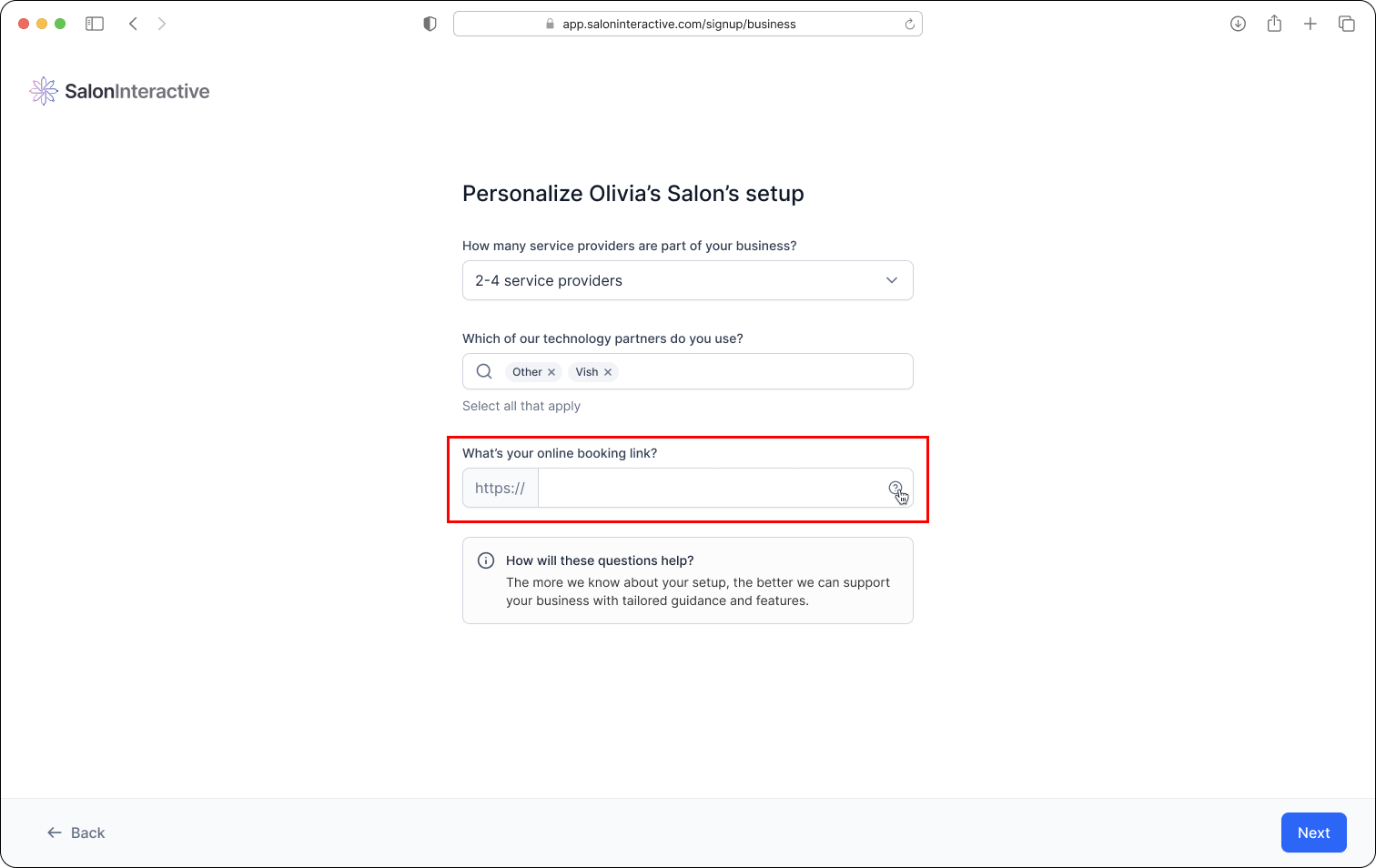 The next two pages will ask a handful of questions about your business. Your answers to these questions help us better tailor features and communications to and for you. However, if you skip any of these questions, you can fill them in later.